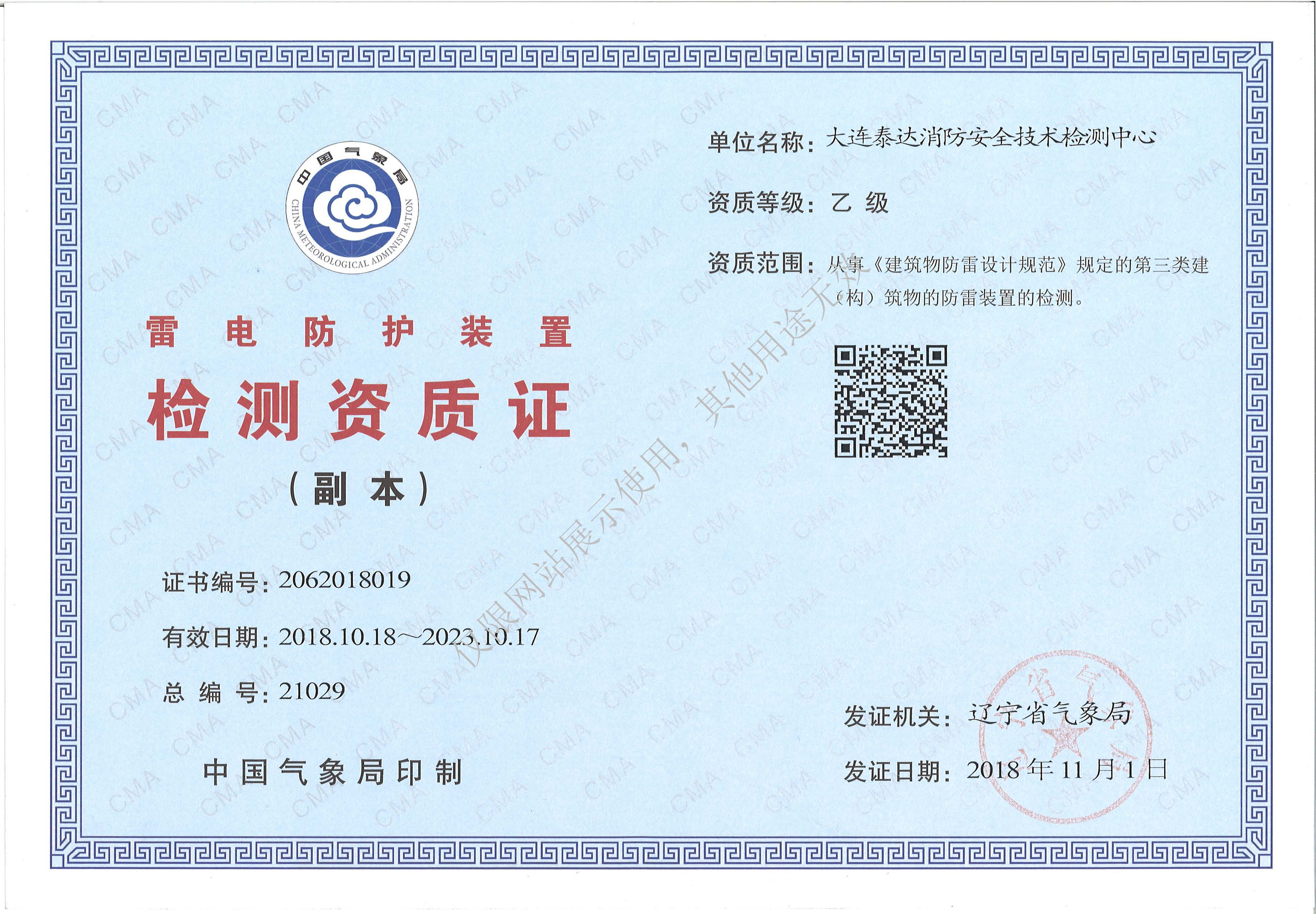 · 是經“社會消防技術服務信息系統”備案并公示的消防技術服務機構,已取得中國氣象局頒發(fā)的雷電防護裝置檢測資質證書、遼寧省質量技術監(jiān)督局審核批準的檢驗檢測機構資質認定證書(CMA)及包括消防檢測、電氣檢測、雷電防護裝置檢測、防火涂層厚度檢測等在內的200余項檢驗檢測能力,取得大連市應急管理局頒發(fā)的安全生產標準化證書,獲得質量管理體系、環(huán)境管理體系、職業(yè)健康安全管理體系認證證書,是經備案的高新技術企業(yè),可獨立出具具有證明作用的檢測報告。